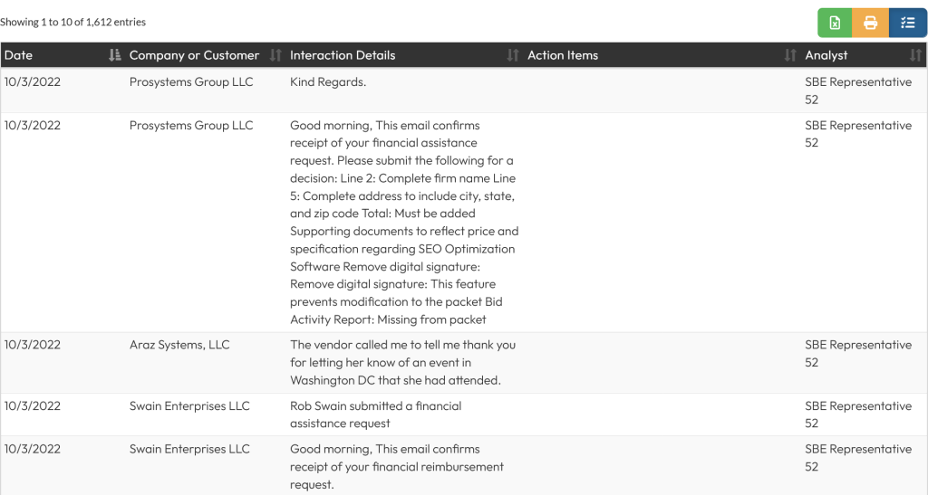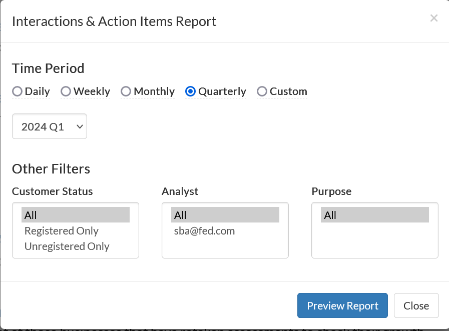 A Full Interactions and Action Items Report can be generated for a specified period of time.