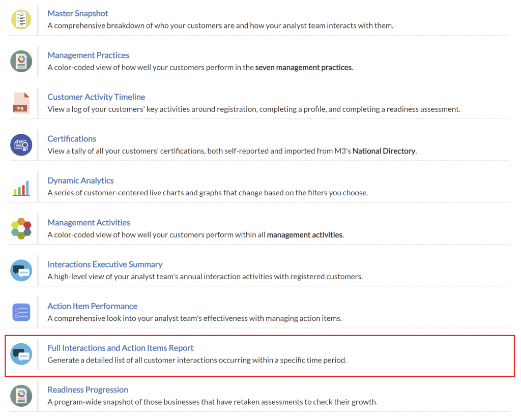 Once clicked, the Affiliate will be navigated to the Reports view. Affiliates can then click the “Full Interactions and Action Items Report” item in the Reports menu.