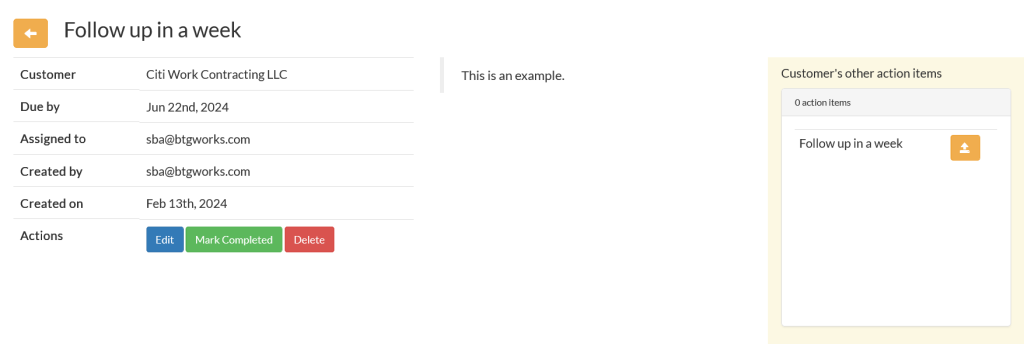 When affiliates open a full detailed view of the action item, they will see all the information that was provided to them in the Action Item Performance table, as well as a list of other action items associated with the relevant customer.