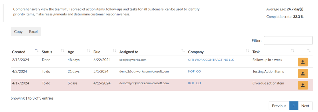 The Action Items Performance Report gives Affiliates a comprehensive view of each analysts full spread of action items, follow-ups and tasks for all customers. This information can be used to identify priority items, make reassignments and determine customer responsiveness.