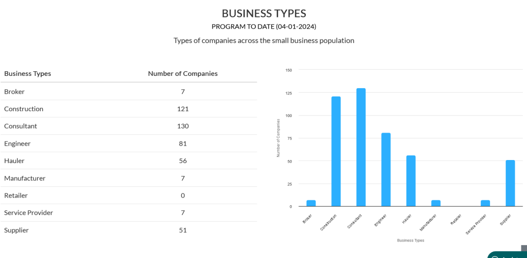 The Business Types section provides affiliates with information about the various types of companies within the small business population. It includes a table and a chart, each representing the distribution of companies across different types of business.