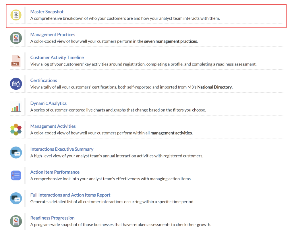 The Master Snapshot Report provides a comprehensive breakdown of who your customers are and how your analyst team interacts with them. A comprehensive and consolidated analysis of key metrics across account activity, business readiness, business types, management tool needs, certifications, and interactions.