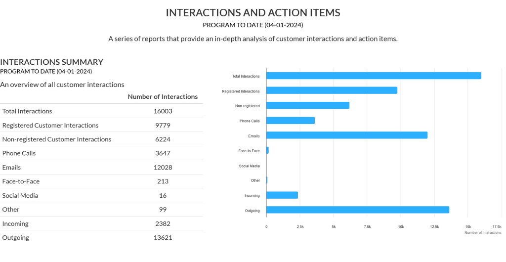 The Interactions and Action Items section informs affiliates about how companies are being engaged within their program. There are multiple charts and tables made available, each summarizing a different perspective regarding how interactions are taking place, as well as with who across the program.