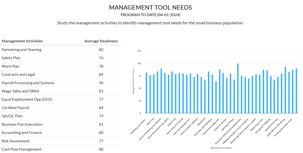 The Management Tool Needs section visualizes the average readiness of small businesses within each individual management activity. Affiliates can use this information to identify which management activities their small businesses could use the most assistance with.