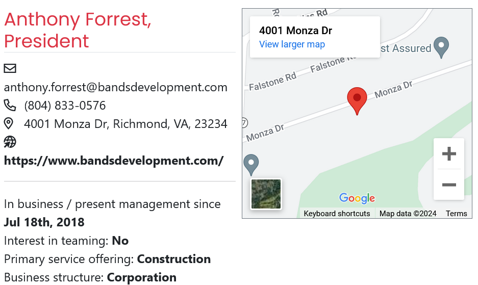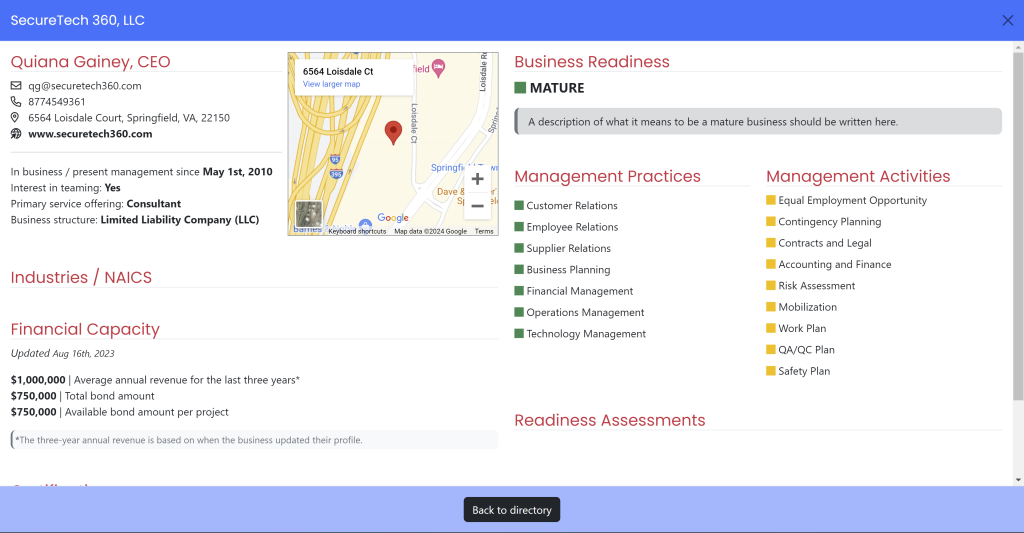 Upon clicking on a record from the Directory table, the Business Profile for the selected business will pop up for the Affiliate to view.