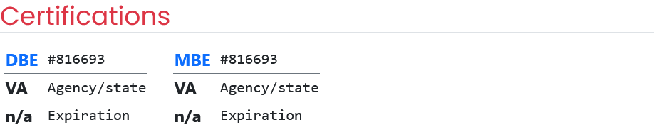 The Certifications section displays the current certifications of the business, including the states of certification and expiration dates. This feature enables affiliates to quickly review the status of certifications held by the company.