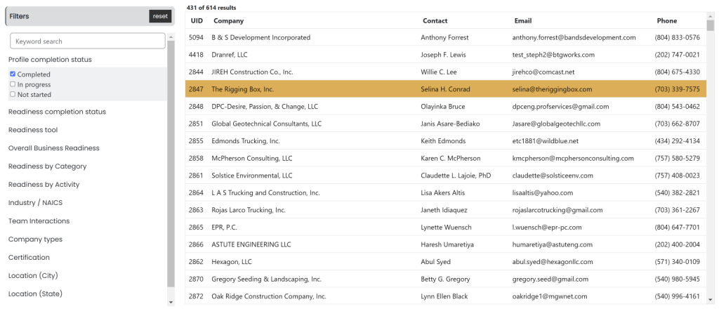 Once clicked, the Affiliate will be navigated to the Directory view. Affiliates can then click on a record from the Directory table to open the Business Profile for the selected business.