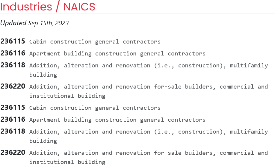 The Industries / NAICS section provides the list of NAICS codes that the business is certified for as well as a date when the list was last updated.