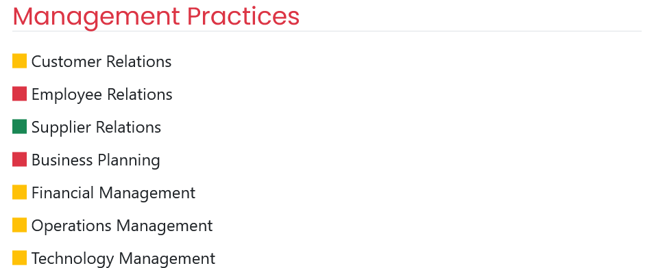 The Management Practices section provides affiliates with a summary of the business’ readiness to conduct the different management practices measured by the assessments they’ve taken.