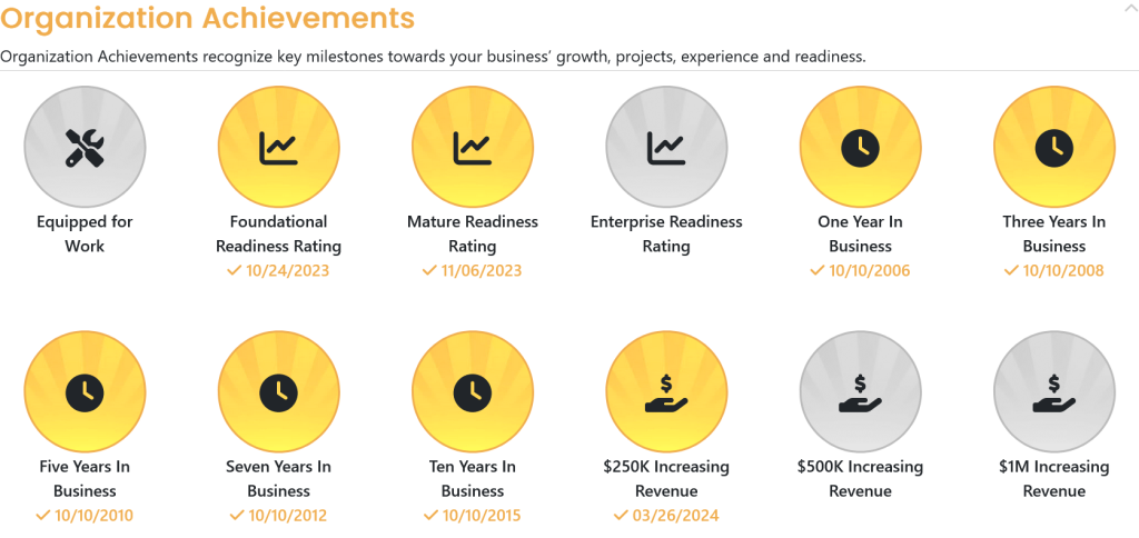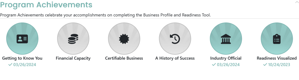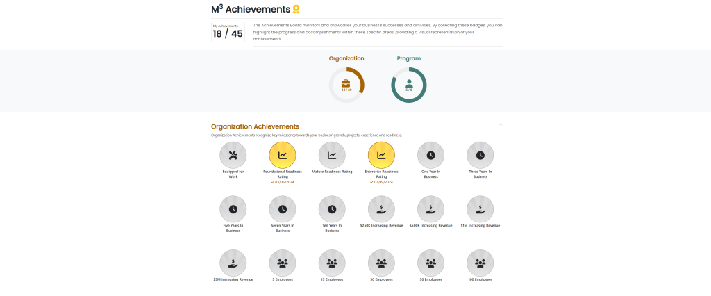 The Program Achievements section highlights the business owner’s accomplishments as they complete their business profile and the readiness tools within M3tm.