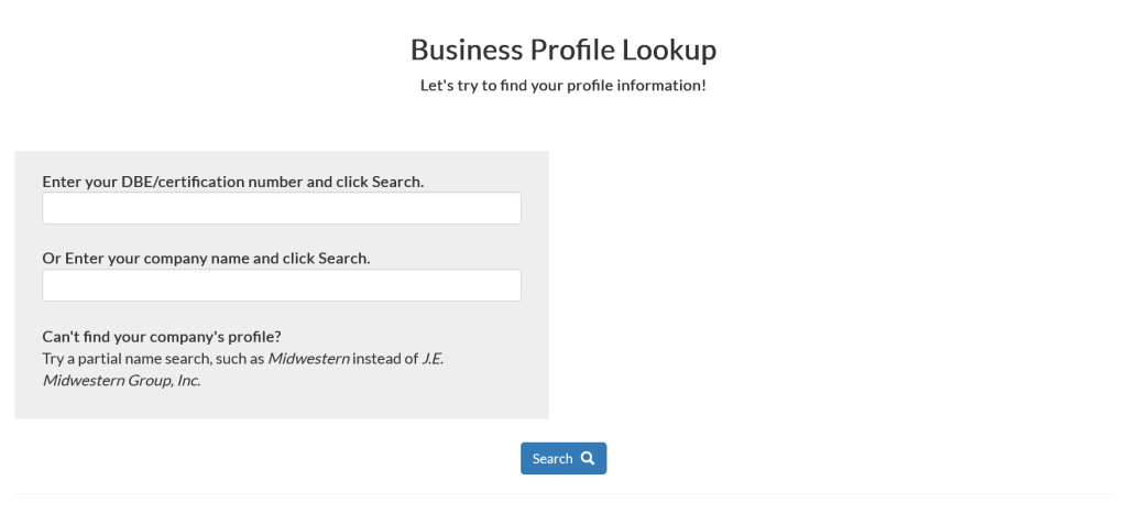 The Business Profile Lookup feature allows companies to search for their DBE certification number or company name to retrieve relevant company information.