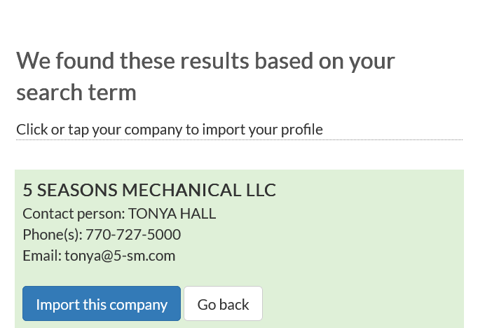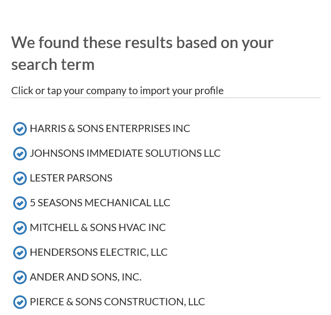 After typing the company name, a list of matching results will appear. Business owners can then select their company from the list and proceed to import the associated data.
